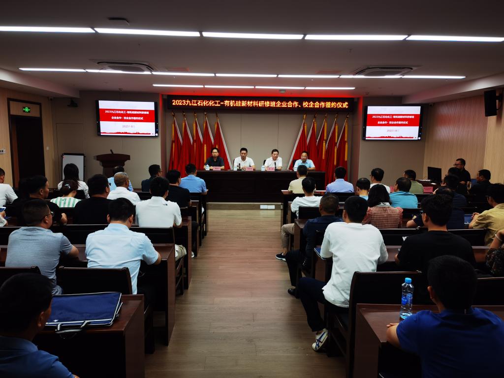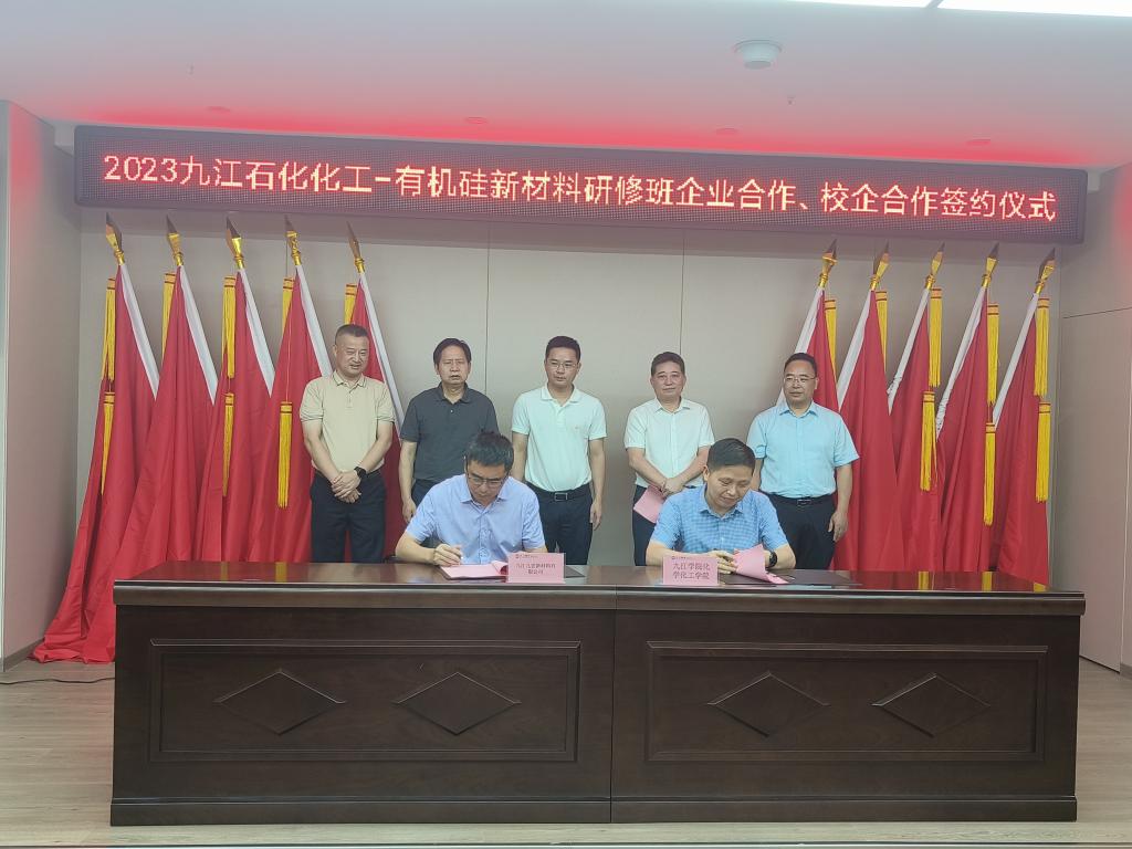 8月30日下午5时30分,在欢快的音乐声中,江西贝特利新材料有限公司总经理欧阳旭频和湖北硅元新材料科技有限公司总经理刘裴,东方巨龙化工有限公司总经理周建龙和江西理文化工有限公司副总经理黄绍威,BB贝博艾弗森化学化工公司副经理占昌朝和九江九宏新材料有限公司周巧荣,先后上台签订意向性企业合作和校企合作协议。据悉,这是2023年全市石化化工-有机硅新材料产业链高层管理人员专业化能力研修班为学员临时安排的一个仪式。九江市政府副秘书长徐松茂、九江市工信局党委书记、局长娄琦,九江市产业升级促进中心主任傅建文、BB贝博艾弗森经理郑祚双及研修班全体学员共同见证了这一特殊时刻。