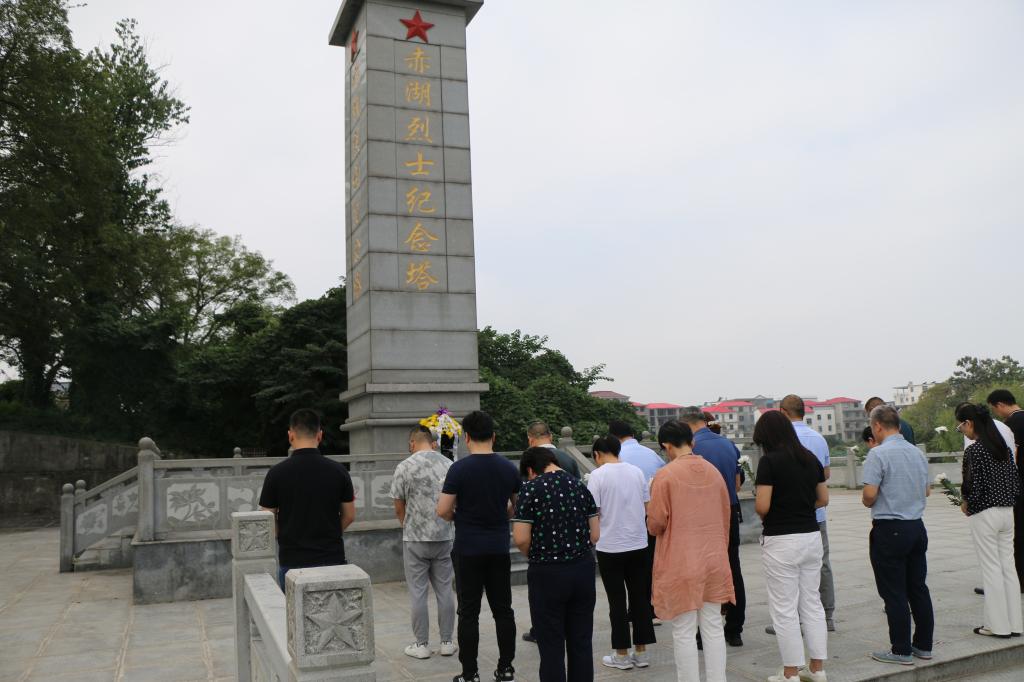 郁郁青柏掩忠骨,烈烈英魂诉长风。在赤湖烈士纪念塔前,全体人员整齐队列,鞠躬行礼、敬献花篮,向革命先烈表达无比崇敬和深切缅怀之情。
